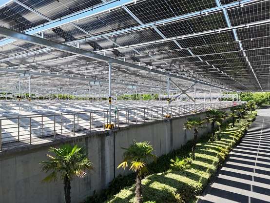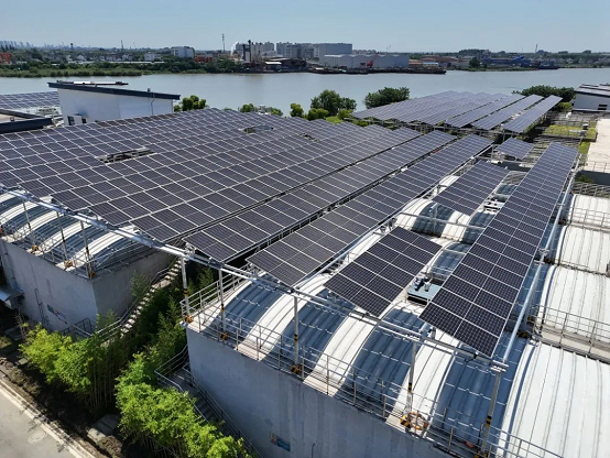 污水處理廠歷來是耗電大戶,而如何將其轉變為發電高手是蘇州工業園區相關主管部門特別關注的課題。蘇州工業園區第二污水處理廠利用廠區約4.4萬平方米反應水池上空及建筑屋頂,鋪設550Wp高效單晶硅光伏組件10400塊,預計年均發電量約581萬千瓦時,基本實現就地全部消納,每年可節約標準煤約1743噸、減少二氧化碳排放約3486噸,達到減污與降碳的雙重效果。此外,污水廠通過采用剛性支架+柔性支架+屋頂光伏的建設模式,最大程度利用了廠區的可建設面積,鋪設的光伏板可以遮擋部分池面,能有效抑制池內水體藻類生長,減少人工清理頻次,實現光伏+污水處理+人工濕地三階跳。