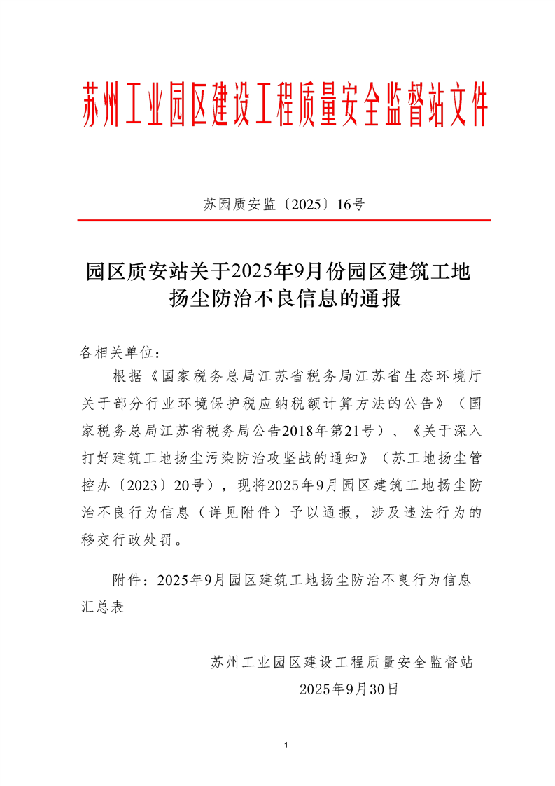 園區質安站關于2025年9月份園區建筑工地揚塵防治不良信息的通報