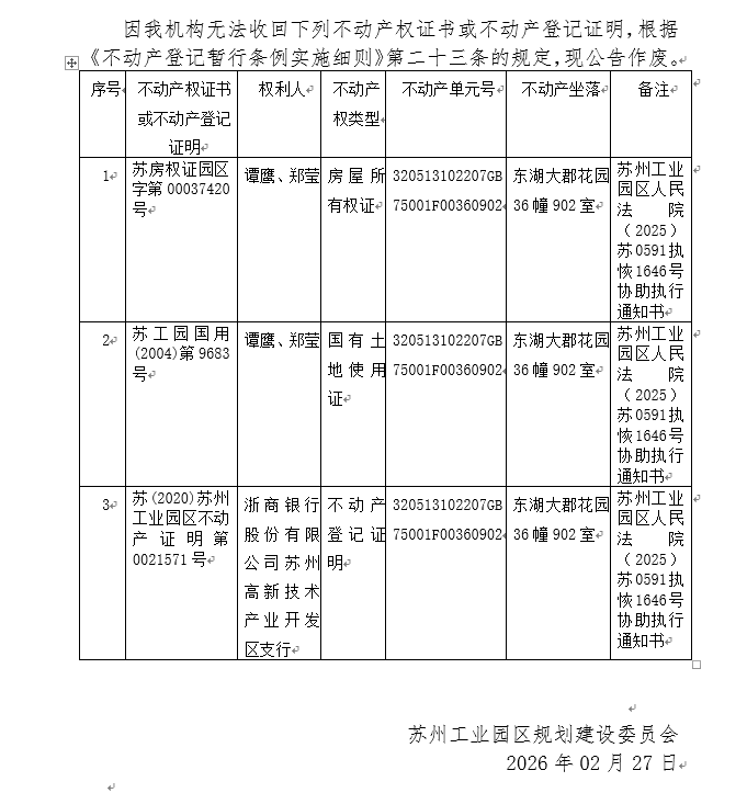 不動產(chǎn)權(quán)證書/登記證明作廢公告蘇園 證廢字2026(0051)號(東湖大郡花園36幢902室)