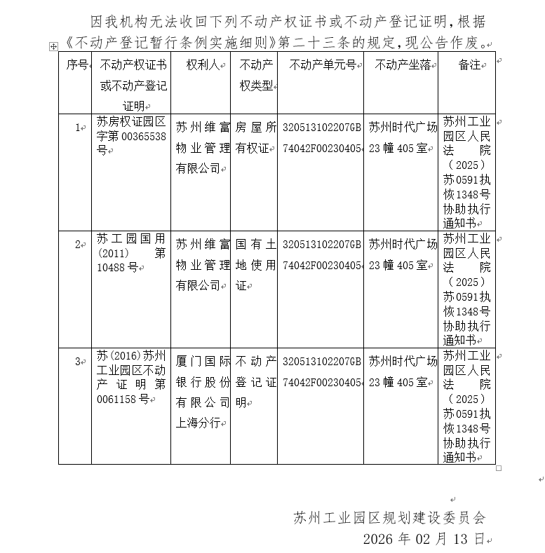 不動產權證書/登記證明作廢公告蘇園 證廢字2026(0040)號(蘇州時代廣場23幢405室)