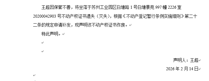 關于蘇州工業園區白塘路1號白塘景苑997幢2226室20200042903號不動產權證書遺失聲明