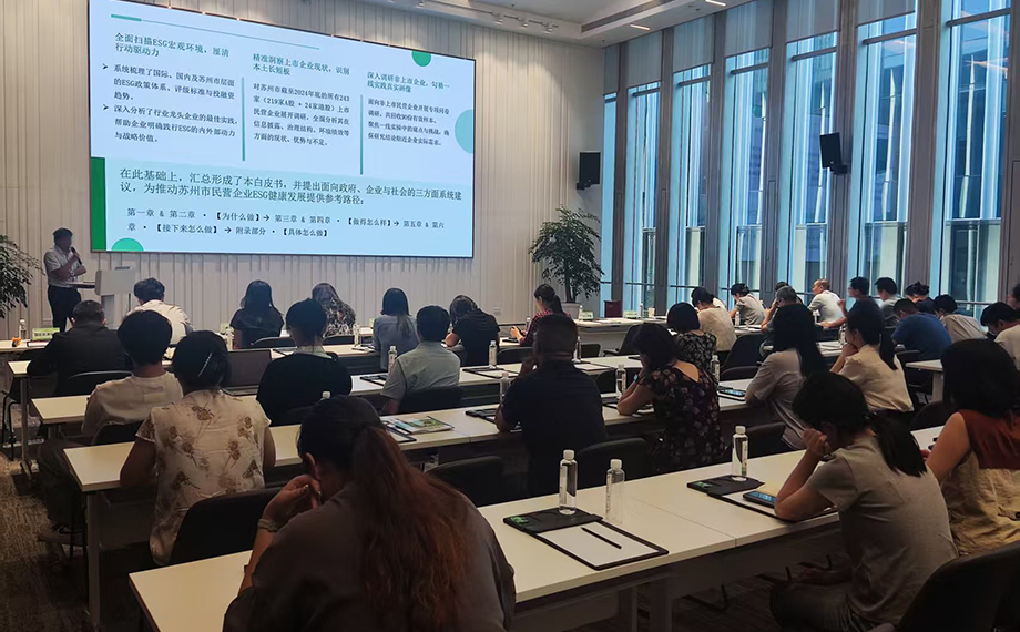 イベントでは、園區都市発展研究院がESGの発展狀況と園區のESG分野における特徴的な取り組みを共有し、ESG公共サービスプラットフォームの関連機能モジュールを紹介した。蘇州市企業持続可能発展連合會は『蘇州市民営企業ESG発展白書』を発表し、白書の作成背景と核心內容について解説した。また、代表企業を特別招き、カーボン削減、再生材料の使用、循環経済の推進による廃棄物削減、顧客の持続可能な発展目標とのウィンウィン関係構築など、グリーンで低炭素な発展の実踐経験を共有した。