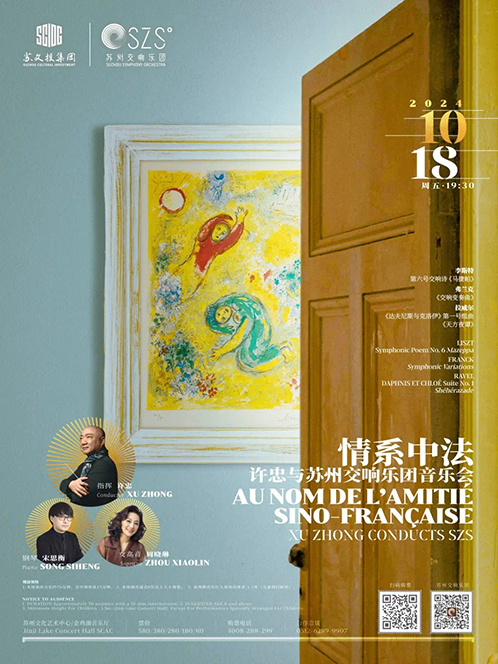 在文化藝術活動方面,本屆蘇州金雞湖中法文化藝術周同樣驚喜連連。本周五晚,“情系中法?許忠與蘇州交響樂團音樂會”將奏響蘇州金雞湖音樂廳。本場音樂會在曲目選擇上精心策劃,將由蘇州交響樂團首席指揮許忠,攜鋼琴家宋思衡、女高音歌唱家周曉琳,帶來李斯特的第六號交響詩《馬捷帕》、弗蘭克的《交響變奏曲》、拉威爾的《達夫尼斯與克洛伊》第一號組曲,以及《天方夜譚》等經典曲目,為蘇州觀眾“端”上極具法式風情的音樂“大餐”。借助音樂這一無國界的“語言”形式,讓中法人民實現情感與精神的自由交流。