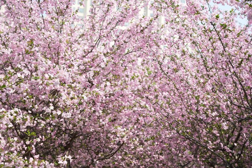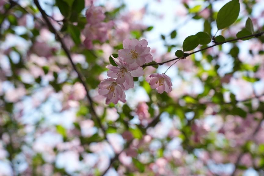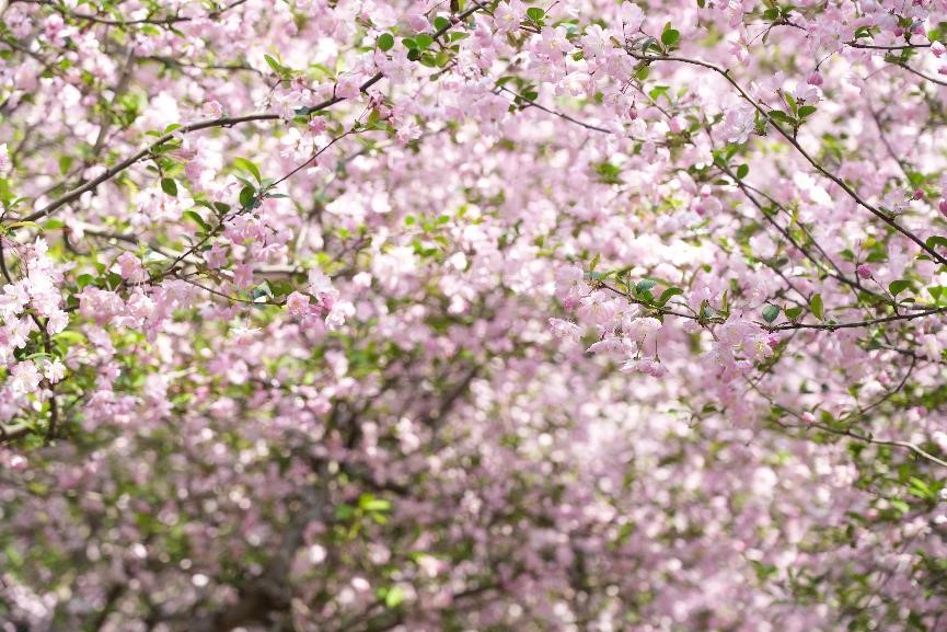 海棠花朵朵盛放時(shí),枝條被花朵壓得微微低垂,形成了一片粉紅色的花海,宛如粉色的云霞,陽光透過花瓣灑下,光影斑駁,形成了一幅幅絕美的畫面。