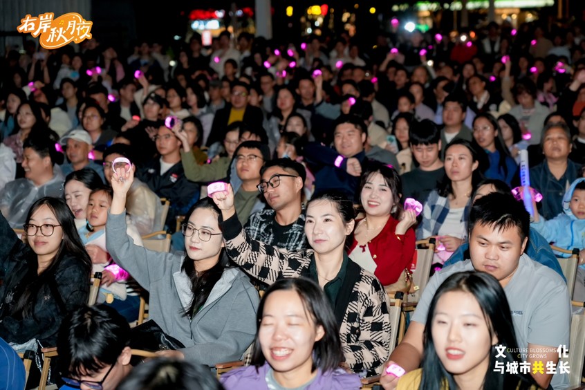 當晚的“右岸秋月夜”歌單,滿是秋的詩意與青春的朝氣,裹挾著蓬勃熱意感染全場。粵語經典《紅日》一響,瞬間點燃現場熱情;《戀愛ing》《小情歌》等曲目則以青澀旋律喚起共鳴。流行樂隊、實力唱將、素人歌手輪番登場,帶著對音樂的熱愛為演出注入鮮活能量。一首首經典曲目引發觀眾頻頻揮手合唱,手中的手環燈光閃爍交織,宛如一片璀璨星海,將獨墅湖的秋夜點綴得格外浪漫。