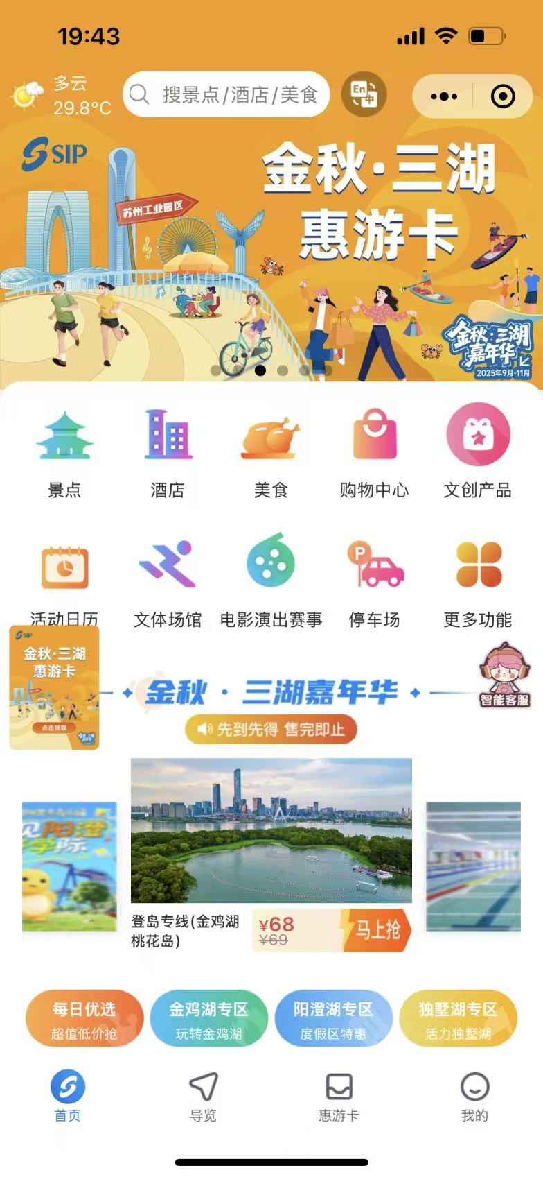 為進一步提升市民游客的幸福感。嘉年華期間,園區發布《金秋?三湖嘉年華指南》,集中呈現活動日程、推薦玩法、消費地圖等實用信息,為市民游客暢享園區金秋文旅盛宴提供全方位指引?!敖鹎铩と萦慰ā焙汀敖鹎铩と文耆A消費券”,則匯聚千余家商戶實實在在的優惠,以及50余場演出、近20場體育賽事和40余場展覽展會,覆蓋餐飲、住宿、文旅、會展、汽車等重點消費領域。游客可以通過“惠游園區”公眾號、“數字金雞湖”、“同程旅行”小程序等平臺,領取專屬折扣與滿減禮遇,將出行、住宿、消費一手掌握。此外,憑借演藝賽事門票,還能兌換通用消費券及商家專屬禮包,延伸文旅體驗,盡享“票根+”福利。