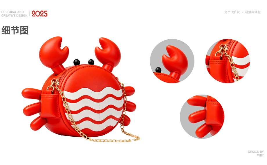 作品聚焦“兒童友好”主題,以“童趣守護(hù)·安全陪伴”為核心,融合陽澄湖大閘蟹形象,設(shè)計(jì)大閘蟹絨絨帽、萌蟹零錢包、大閘蟹樂高,全系列在萌趣造型之外,將安全性、互動(dòng)性與益智性放在首位。