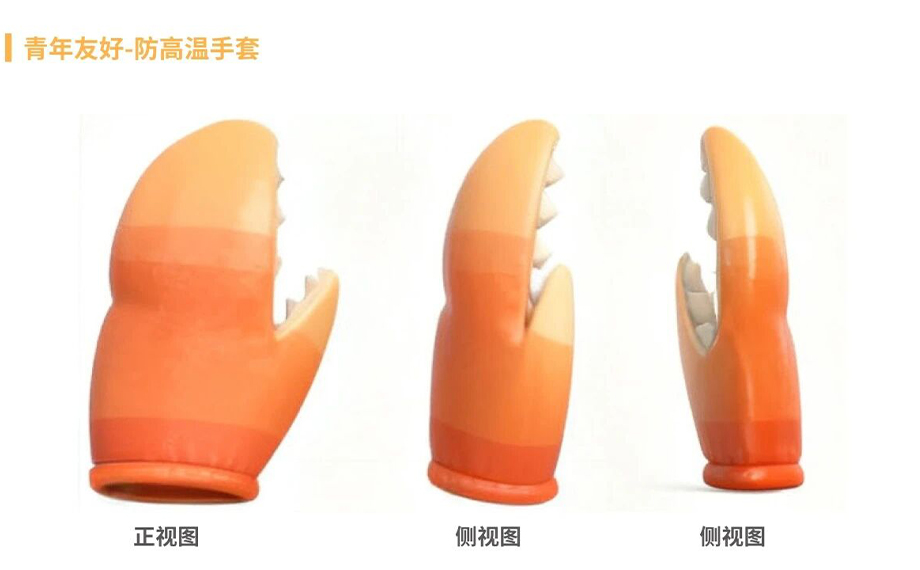 作品緊扣“實(shí)用主義”,深刻理解年輕人對“顏值與實(shí)力并存”的追求。防高溫手套內(nèi)部采用高效隔熱材料,外部防滑耐磨;止汗帶主體使用高彈、吸汗快干面料,確保功能性與舒適度。螃蟹背包造型萌趣,構(gòu)成了一個(gè)積極快樂的卡通形象,讓孩子能夠在出行中編織自己與“蟹寶”的故事。