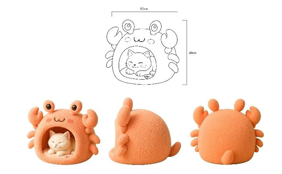 作品以“陽澄湖大閘蟹”為靈感,結(jié)合寵物友好主題進(jìn)行設(shè)計(jì)。延伸出一系列包含螃蟹貓窩、水杯、頭盔、寵物碗的設(shè)計(jì),整體造型Q萌。不僅滿足寵物的休憩需求,同時(shí)也呼應(yīng)了環(huán)保與循環(huán)利用理念。