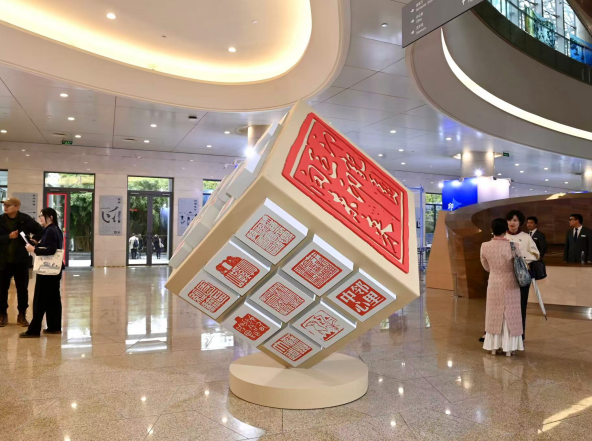 本次展覽突破傳統(tǒng)篆刻展陳模式,以“科技+藝術(shù)”賦能文化傳播。展覽主題印“印記園區(qū)印向未來”以園區(qū)標(biāo)志性建筑東方之門、藝術(shù)中心、飛翔雕塑等為主體造型,通過全息棱鏡技術(shù)動態(tài)呈現(xiàn)印章作品,讓觀眾直觀感受“江南文化”與“現(xiàn)代科技”的碰撞,實(shí)現(xiàn)傳統(tǒng)藝術(shù)與現(xiàn)代科技的碰撞與賦能。展覽突破傳統(tǒng)篆刻展的邊界,創(chuàng)新融入新內(nèi)容、新題材、新設(shè)計(jì)、新造型、新材料與新科技。參展印章的材料選擇極為多元,除傳統(tǒng)印材外,陶瓷、樹脂、空心玻璃微珠等十幾種新材料驚艷亮相。機(jī)器刻制、3D打印、激光雕刻、彩色噴繪等10余種科技治印方法在展覽中廣泛應(yīng)用,各種新材料與新技術(shù),讓傳統(tǒng)篆刻藝術(shù)煥發(fā)活力。