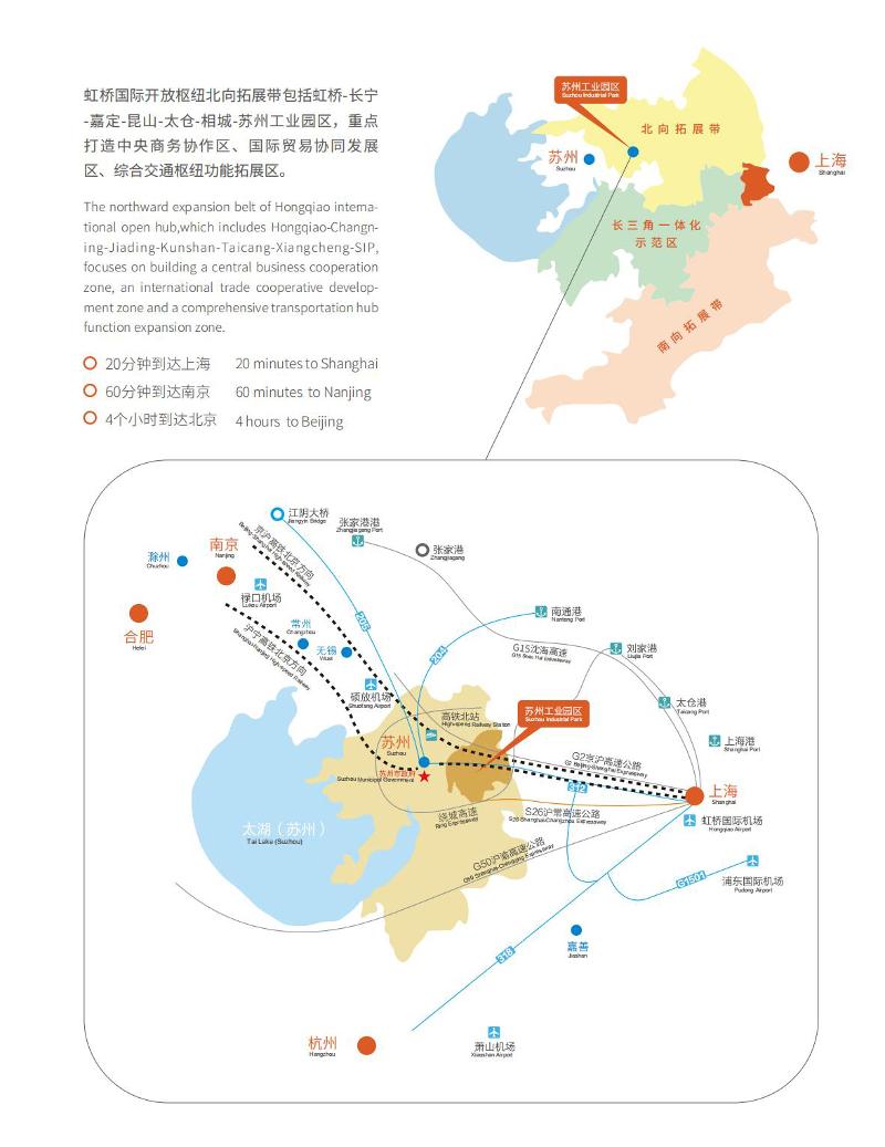 蘇州工業(yè)園區(qū)是蘇州面向未來的城市新中心,以發(fā)達的高速公路、鐵路、水路及航空網(wǎng)與世界各主要城市相連;軌道交通20分鐘到達上海、60分鐘到達南京、4個小時到達北京,是長三角地區(qū)重要的總部經(jīng)濟和商務文化活動中心,是虹橋國際開放樞紐北向拓展帶的重要一環(huán)。