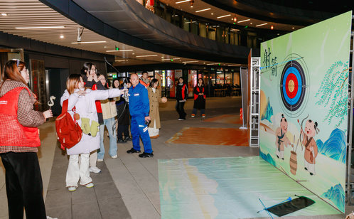 作為市集“集券核心打卡點”,古風運動區的蹴鞠、射箭、投壺三大項目一經開放就人氣拉滿。活動以游園券作為通用兌換憑證,完成運動項目即可獲取,趣味與挑戰性拉滿?,F場,紅色管家志愿者全程在線指導規則、示范動作,青年情侶、好友組隊摩拳擦掌踴躍參戰。蹴鞠場地里,大家瞄準目標全力開踢,命中瞬間的歡呼聲此起彼伏;射箭區域內,年輕人踮腳拉弓、精準瞄準靶心,專注模樣收獲一眾點贊;投壺項目前,參與者屏息凝神投放箭矢,每中一支都忍不住歡呼喝彩。不少青年組隊PK挑戰,在競技互動中拉近距離,一張張游園券不僅是實力的證明,更裝滿了歡樂時光。