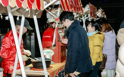 非遺美食區的煙火氣,妥妥拿捏了年輕人的味蕾。糖畫、冰糖葫蘆、海棠糕、吹糖人、赤豆小圓子五大傳統美食現場制作,香氣直撲鼻腔,吸引大批青年排隊兌換。糖畫攤主手持糖漿壺,手腕輕轉間,龍、鳳、小兔子等可愛造型躍然板上,年輕人圍在一旁舉著手機拍攝,拿到專屬糖畫立刻打卡分享;冰糖葫蘆攤位前,晶瑩糖衣裹著新鮮山楂,酸甜口感瞬間喚醒童年記憶,成為青年們的懷舊必選;海棠糕、赤豆小圓子香味撲鼻,驅散了夜晚涼意,暖心又暖胃。這些美食不僅滿足味蕾,更讓年輕人在品嘗中解鎖傳統風味的新潮打開方式,感受民俗文化的溫度。