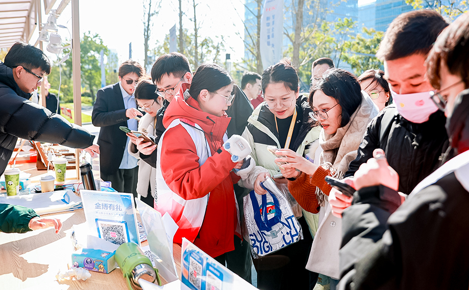 最聚人氣的當屬蘇式美食區,剛出爐的蟹殼黃香氣四溢,海棠糕表面的糖霜泛著光澤,攤位前早已排起長龍。市民張女士在新建元數智灣工作,她熟稔地打開數字金雞湖APP,掃描商戶展示的數幣聚合支付碼,僅需幾秒便完成付款。“以前總擔心數幣支付操作復雜,現在一碼通掃太方便了。”她手握熱乎的點心笑著分享,“剛剛還參與了數幣抽獎,抽中了‘滿50減20’的優惠券,等會兒再去別的攤位逛逛。”