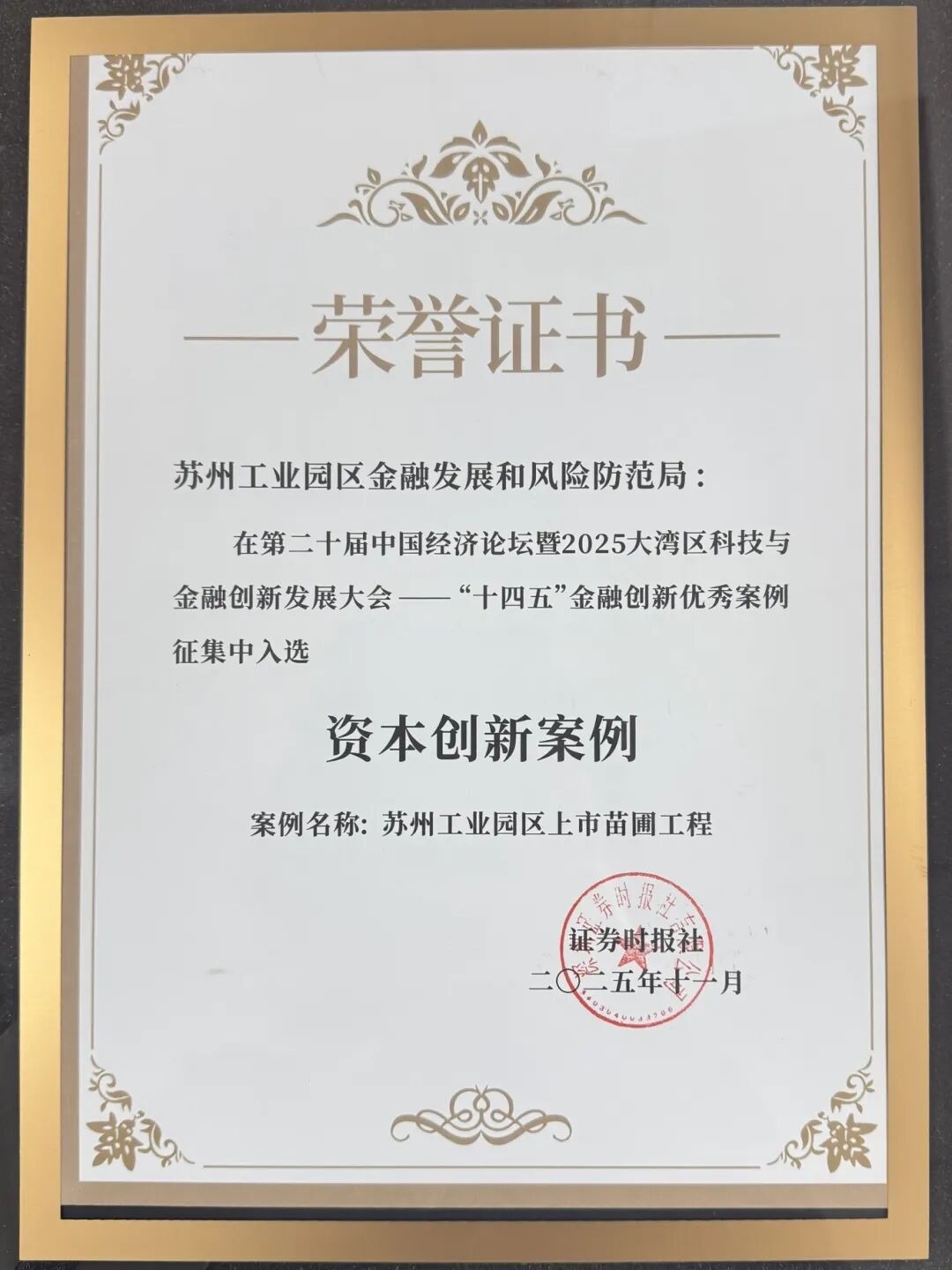 11月18日,第二十屆中國經濟論壇在廣州南沙召開,會上發布了“十四五”金融創新優秀案例,蘇州工業園區“上市苗圃工程”成功入選,是本次入選的唯一政務服務創新案例。
