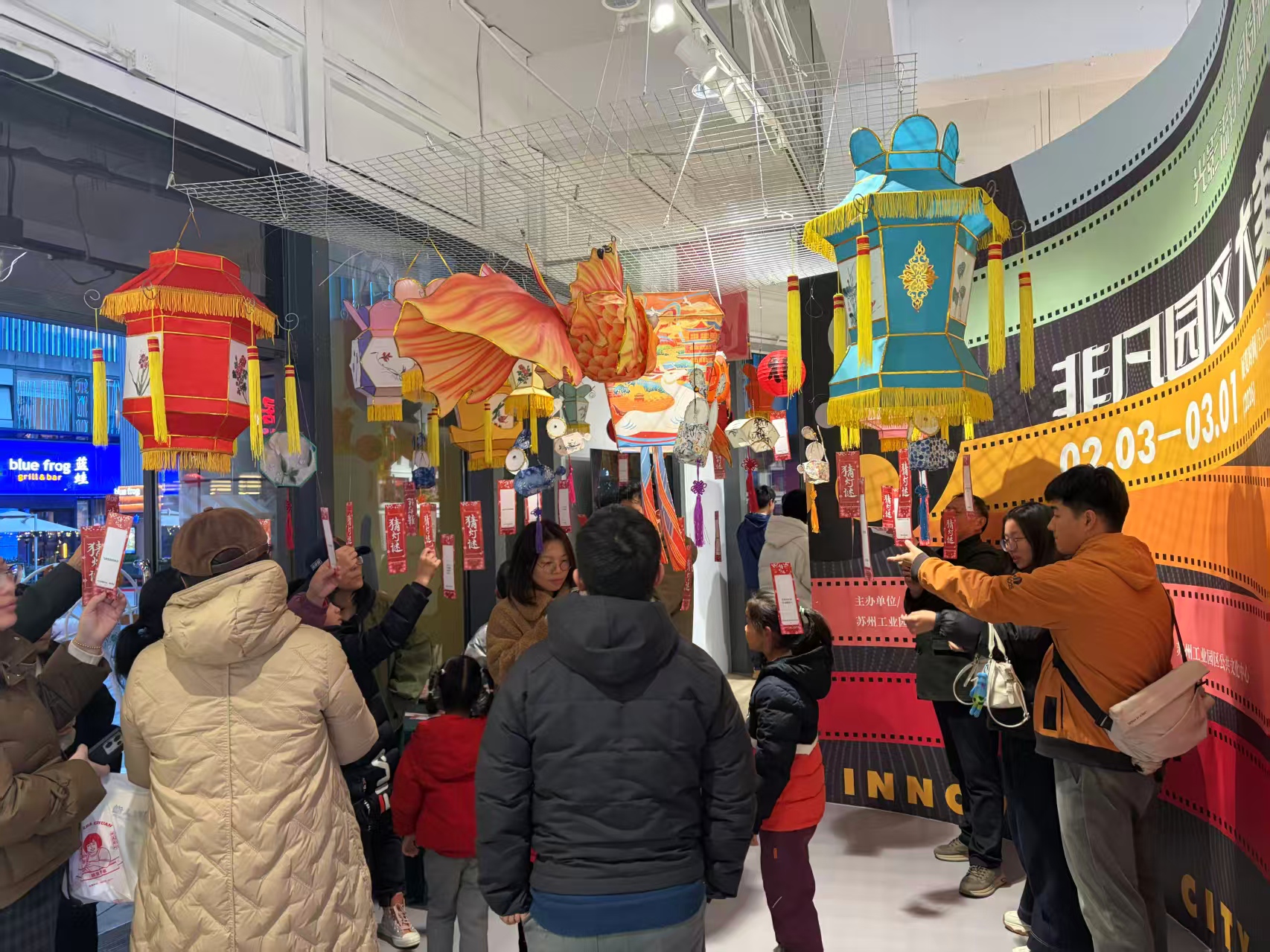 元宵當晚,“燈火映元宵 鄰里共團圓”鄰里上元集點亮全區各鄰里中心,猜燈謎、贈湯圓、飛花令、趣味游戲輪番登場,全新銀票兌禮玩法人氣高漲。主會場兆佳巷鄰里中心魚燈巡游、國潮樂隊、變臉表演精彩紛呈,成為元宵夜游熱門打卡地。此外,688藝術潮流空間、奧體中心商業廣場、久光百貨、新光天地蘇州等同步開展燈謎互動等活動,節日氛圍持續拉滿。