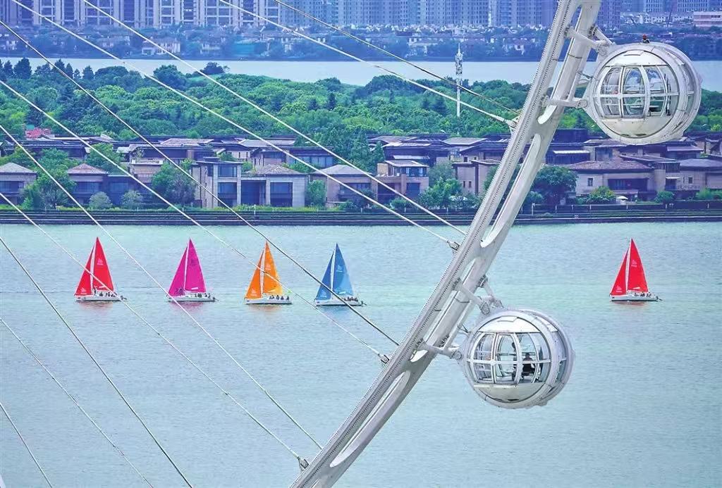 昨日,園區(qū)金雞湖景區(qū),水上運動愛好者駕馭風帆,感受風的韻律。
