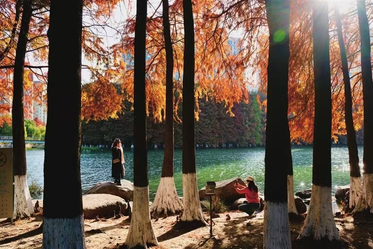 連日來,蘇州工業(yè)園區(qū)十里斜塘水杉染霞,吸引眾多市民、游客前來享受浪漫時光。