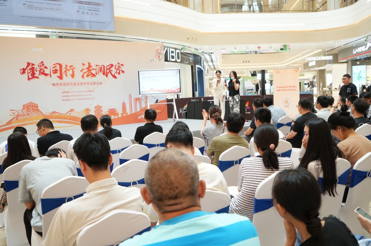 為切實(shí)提升民族宗教政策和法律法規(guī)覆蓋面與知曉度,增強(qiáng)園區(qū)居民民族宗教政策法規(guī)學(xué)習(xí)熱情,6月19日下午,由園區(qū)民宗局指導(dǎo)、唯亭街道辦事處承辦的“唯愛(ài)同行 法潤(rùn)民宗”民宗政策法規(guī)主題宣傳活動(dòng)在蘇州星湖龍湖天街圓滿舉辦。唯亭街道辦事處有關(guān)領(lǐng)導(dǎo)、唯亭街道各社區(qū)民宗干部及社會(huì)各族各界群眾代表等100余人參加本次活動(dòng)。