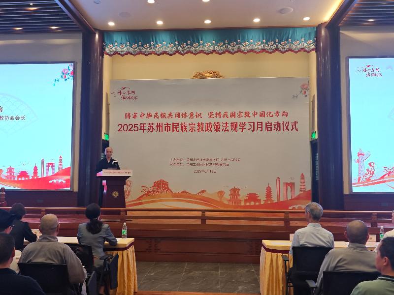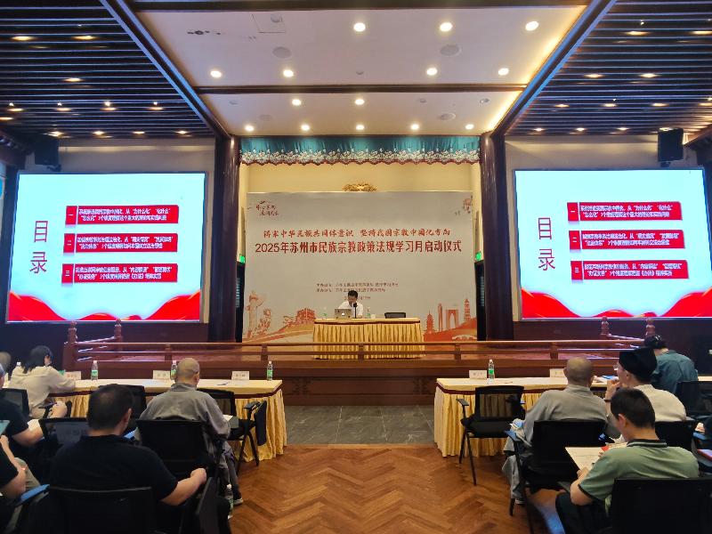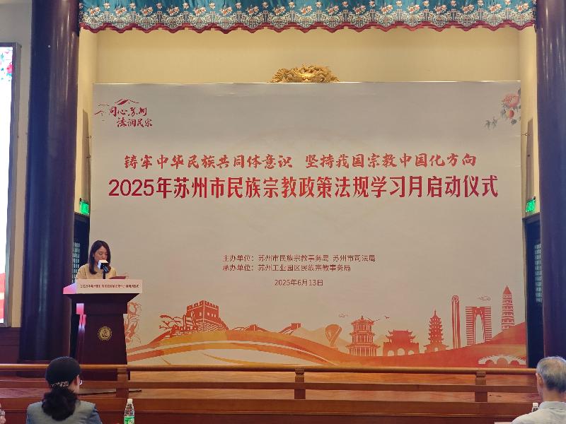 6月13日下午,由蘇州市民宗局、蘇州市司法局主辦,蘇州工業(yè)園區(qū)民宗局承辦的2025年蘇州市民族宗教政策法規(guī)學(xué)習(xí)月系列活動(dòng)在蘇州工業(yè)園區(qū)重元寺順利舉辦。園區(qū)宣傳和統(tǒng)戰(zhàn)部、各街道、各社區(qū)、民促會(huì)、各宗教團(tuán)體、各宗教院校、各宗教活動(dòng)場所有關(guān)負(fù)責(zé)人及社會(huì)各族各界代表人士等150余人參加了本次活動(dòng)。