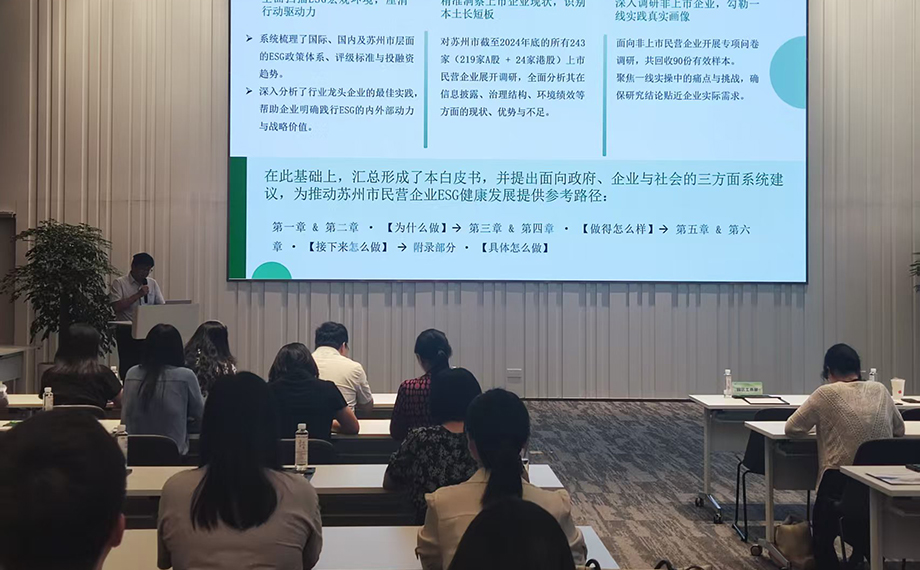 活動上,園區(qū)城市發(fā)展研究院分享了ESG發(fā)展近況及園區(qū)ESG領域的特色亮點,展示了ESG公共服務平臺的相關功能模塊。蘇州市企業(yè)可持續(xù)發(fā)展聯合會介紹《蘇州市民營企業(yè)ESG發(fā)展白皮書》,圍繞白皮書編制背景與核心內容進行解讀。