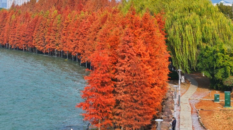 沿斜塘河漫步,成片水杉林沿河岸綿延,形成一道溫暖的濱水風景線。午后陽光穿過赤金色枝葉,在步道上投下斑駁光影,讓河岸變成了一幅絕美的油畫。