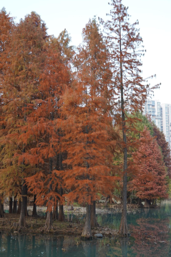 初冬時節,白鷺園棕褐色的水杉林間,挺拔樹干與水中倒影構成對稱畫卷。木質棧道蜿蜒林中,水鳥掠過水面,為靜謐畫面注入靈動生機,成為逃離喧囂、尋覓寧靜的絕佳去處。