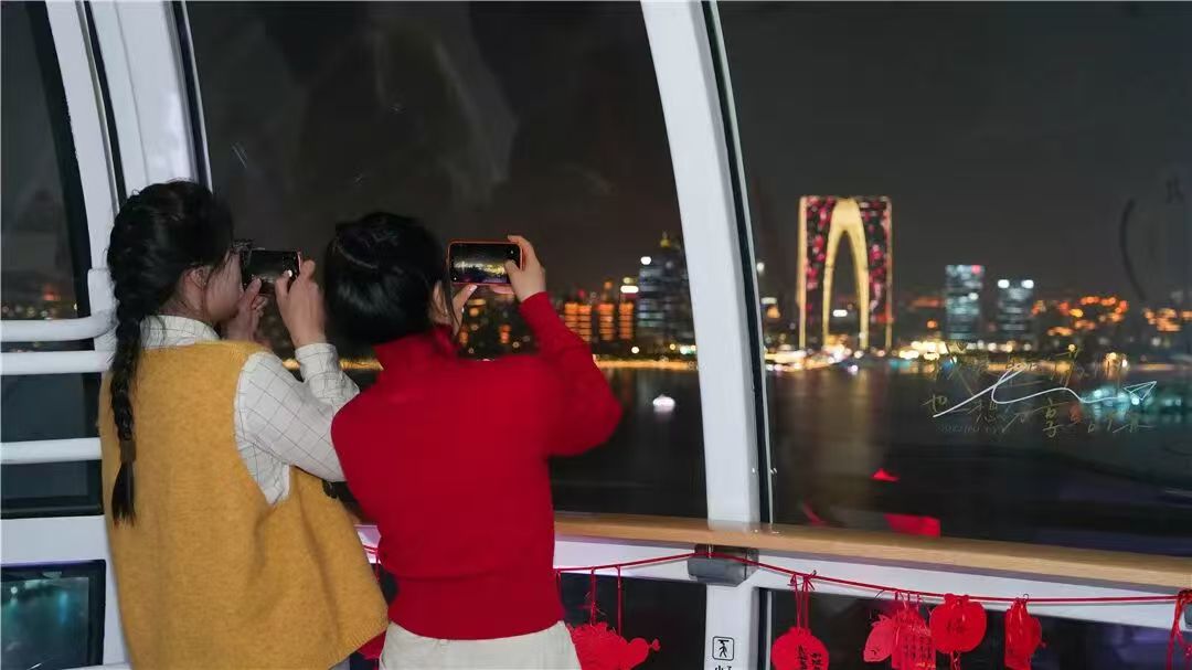 濃濃年味還藏在金雞湖的水波里。環金雞湖區域新春主題燈光秀——“闖丙午”上線,燈火璀璨、流光溢彩;金雞湖音樂噴泉多日連映,沉浸式光影秀奏響新年序曲,帶給市民游客極致的視覺與聽覺享受;金雞湖右岸“飛翔”雕塑下,郁金香層層疊疊盛放,紅的熱烈、粉的爛漫,隨手拍都是春日畫報,吸引眾多游客駐足留影;蘇州之眼同步推出魚燈巡游、愛樂之城國潮電音派對、機器狗拜年等趣味互動,將科技元素注入傳統年味,傳統民樂與現代電音碰撞融合,打造潮流年味盛宴。