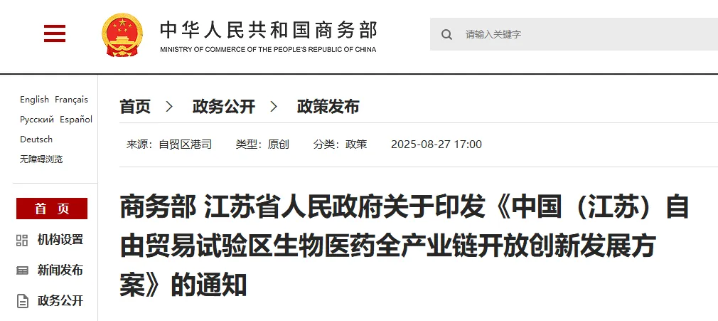 2025年8月,經國務院同意,商務部和江蘇省人民政府聯合印發江蘇自貿區生物醫藥全產業鏈創新發展方案。江蘇成為全國第一個獲批生物醫藥領域試點的省份。針對方案,江蘇省人民政府也印發了專項實施方案,包含77項政策舉措。目前,蘇州自貿片區已推進31項政策落地見效。