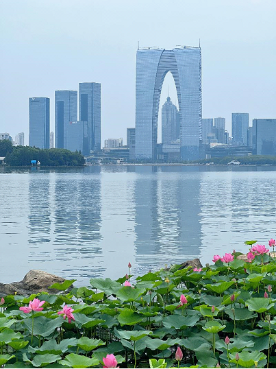 Different from the water lilies, the lotus flowers stand tall above the water, looking elegant. The flowers and the skyscraper Oriental Arc in the distance form a unique scene, attracting many people to photo with them.
