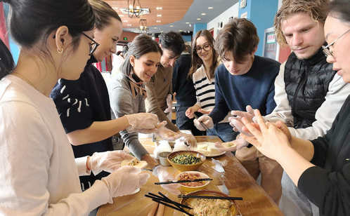 A number of Chinese and foreign students enhanced friendship through the event by making dumplings and festival decorations such as traditionally printed Chinese character “Fu” (meaning happiness and luck) on red paper and paper-cuts together.