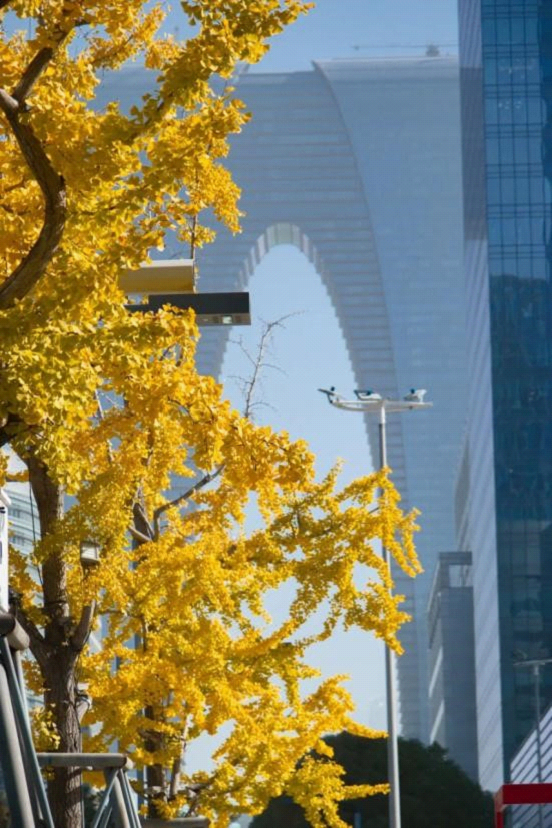 Along the Suzhou Avenue, flanked by modern skyscrapers, the golden hues of ginkgos add the brightest seasonal tones to this urban canvas.