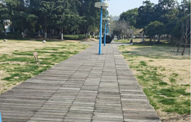中央公園木棧道建成使用多年,因木龍骨基礎(chǔ)結(jié)構(gòu)老化腐蝕,導(dǎo)致上層賈拉木板出現(xiàn)松動、起伏及緊固件外露等問題,既影響市民游園安全,也有損景觀整體風(fēng)貌。經(jīng)專業(yè)技術(shù)評估確認(rèn),原鋪設(shè)的賈拉木板材雖歷經(jīng)風(fēng)雨,但其材質(zhì)優(yōu)良,主體部分性能仍滿足使用要求,具備較高再利用價值。基于此,確立了“最大化利用舊材、系統(tǒng)性加固基礎(chǔ)、精細(xì)化修繕更新”的改造原則。